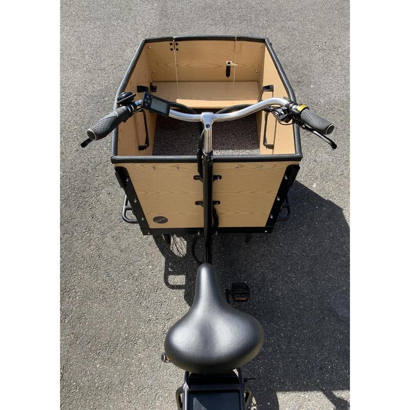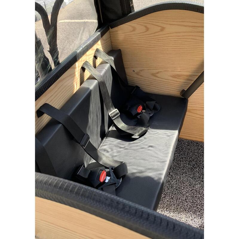 La cargo Box permettra jusqu’à 4 enfants à bord, comme à vos colis ou courses d’être transportés au sec. Il est équipé de 2 arches amovibles escamotables et d’une capote pluie dotée de fenêtres transparentes et ouvrantes (zip). Cet équipement est inclus avec le eCargo.